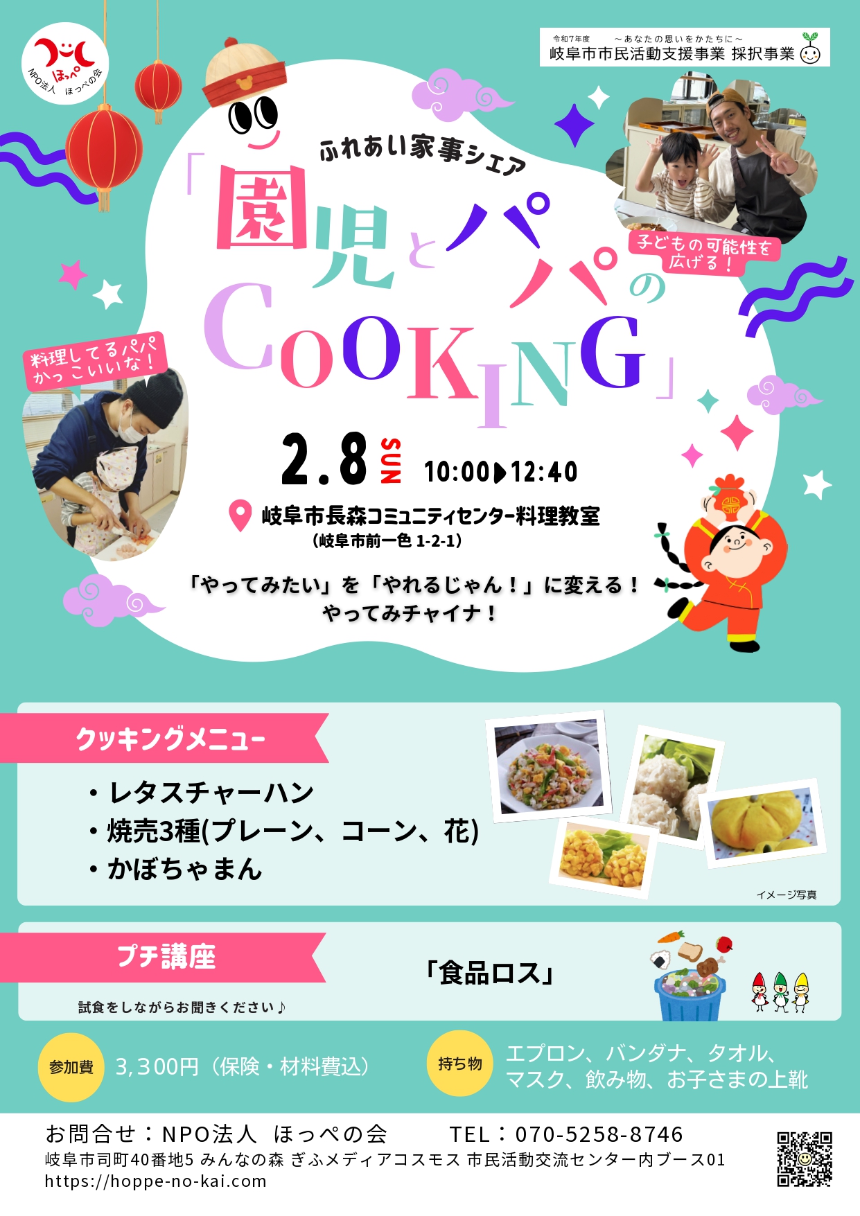 - 楽しく参加いただき何事も無いように細心の配慮をしておりますが、万が一事故などがあったときのために、この講座は保険に加入させていただいております。(保険代:ほっぺの会負担)